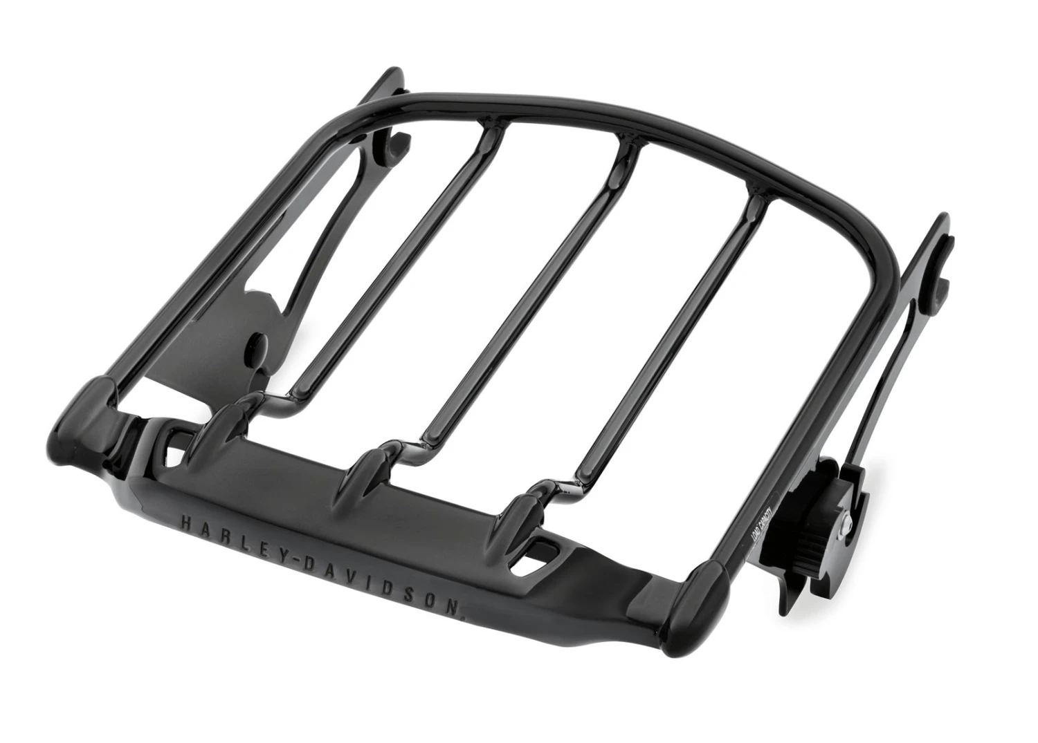 - Available in mirror chrome or rich gloss black finish, the rack draws your eye with its sleek lines, and the engraved Harley-Davidson script adds a signature touch