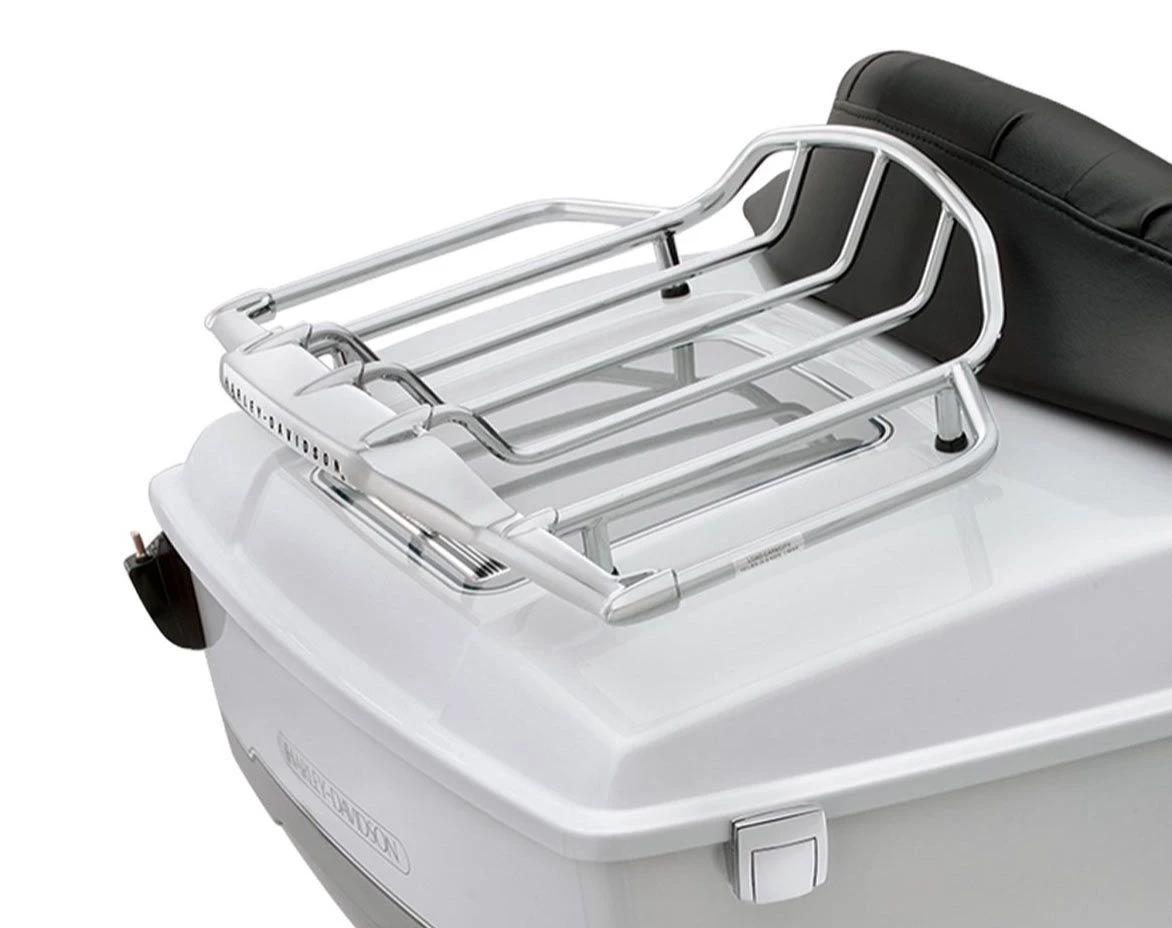 - Available in mirror-chrome or rich gloss black finish, the rack draws your eye with its sleek lines, and the engraved Harley-Davidson script adds a signature touch