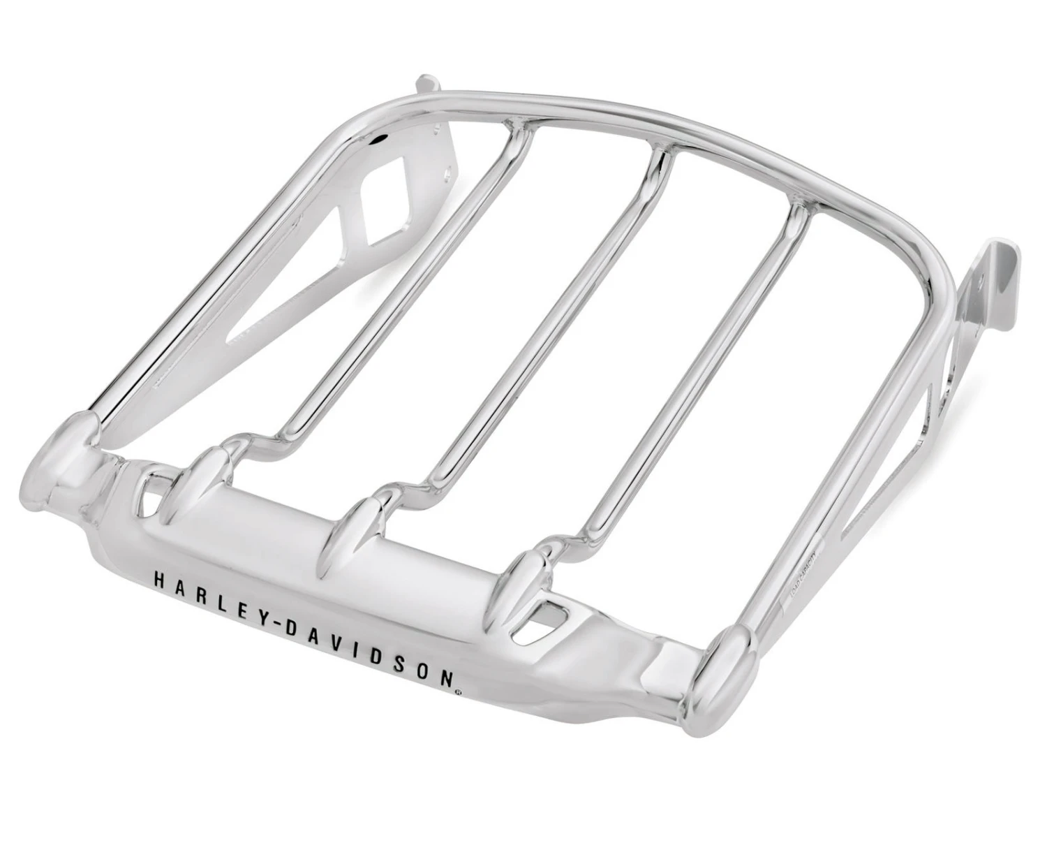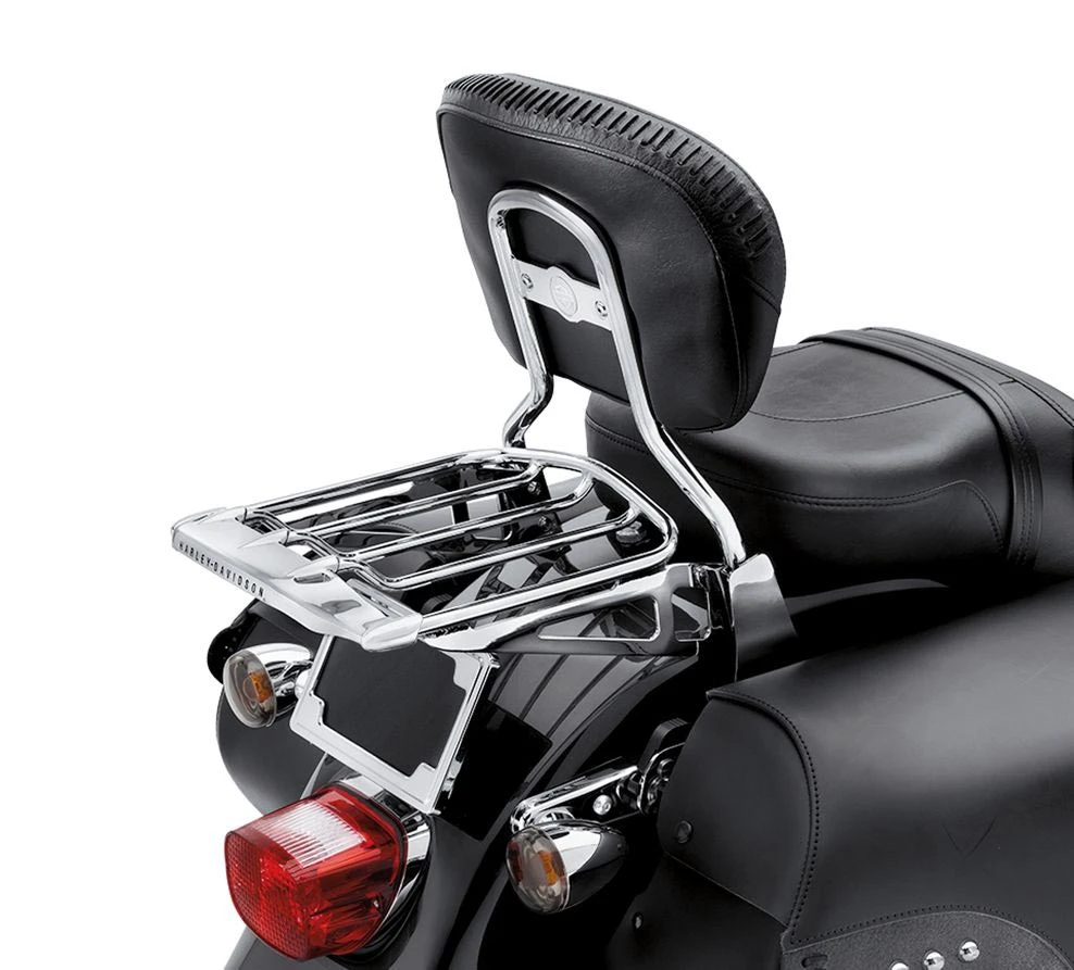 - Available in mirror-chrome or rich gloss black finish, the rack draws your eye with its sleek lines, and the engraved „Harley-Davidson“ script adds a signature touch