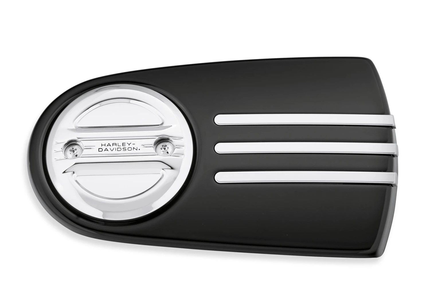 Shaped to cheat the wind. The polished and mirror-chromed Airflow Collection features a raised bridge with 3 laminar grooves that float over the recessed panels. The layered surfaces capture light and shadows, and frame the subtle black-filled Harley-Davidson signature.