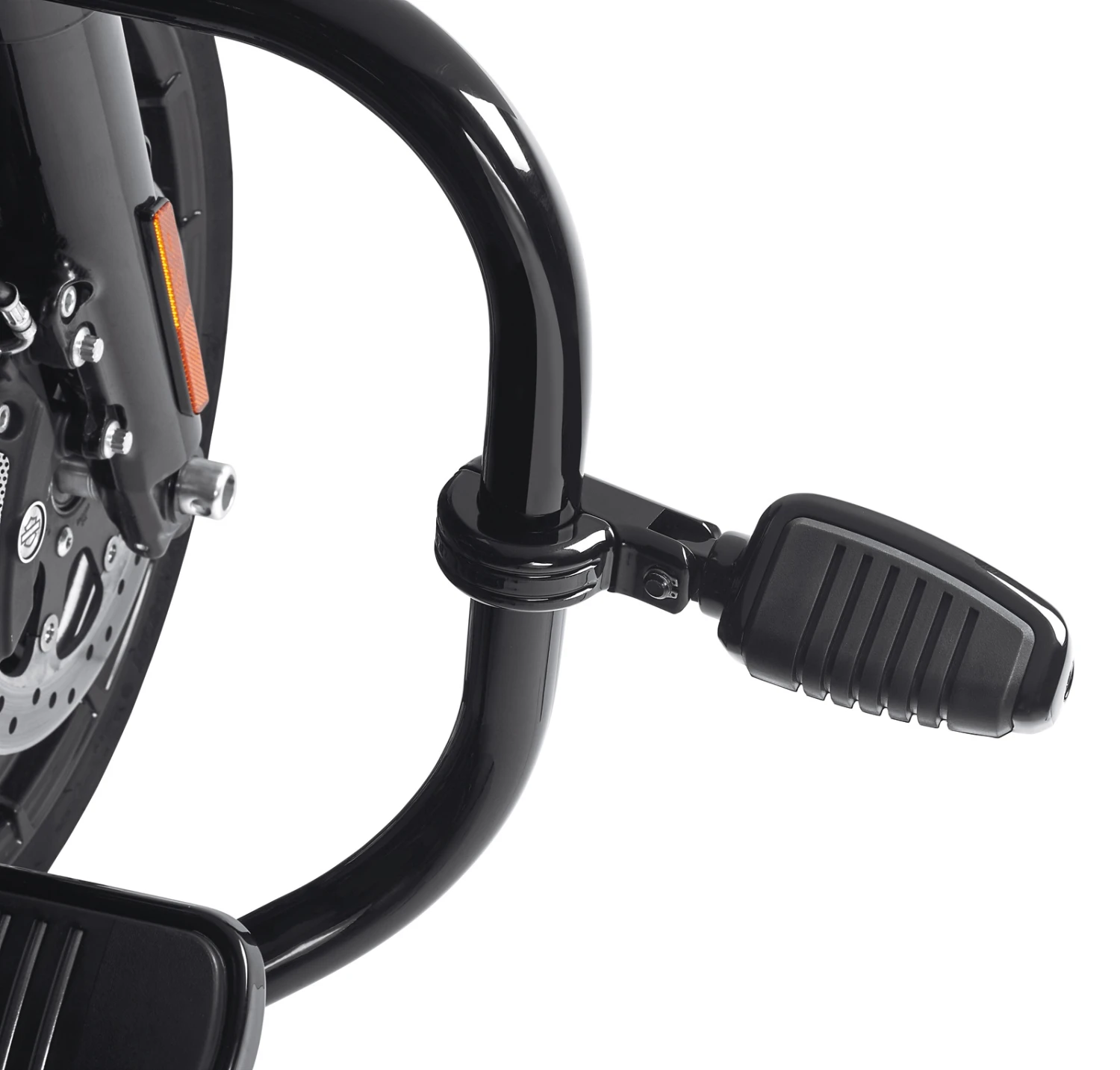 Fits on front engine guards with 1-1/4″ diameter tubing (except VRSC Guard P/N 49267-01A, 49388-09, XL Engine Guard P/N 49060-04A, 49215-07 or Softail Nostalgic Engine Guard P/N 49037-05A). Requires separate purchase of Chrome Bullet Tip Footpeg Bolt Kit P/N 94133-01. Works with all H-D style male-mount footpegs.