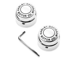 Die-cast, chrome-plated covers feature the „Harley-Davidson Motor Co.“ logo in black.