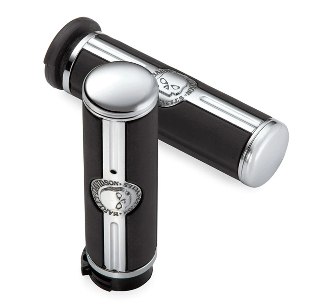 Contrasting the chrome sinister skull logo surrounded by „Harley-Davidson“ script, the raised rubber pads add positive grip and comfort for the long haul. Easy to install, these grips feature a „glueless“ design that allows removal without damage.