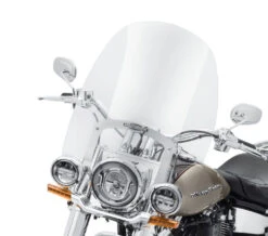 A windshield provides a barrier between the rider and errant bugs, discarded cigarette butts, flying debris and bad air. The shield manages airflow and wind blasts to create a pocket of still air for both rider and passenger comfort. But its not just about function. This one-piece windshield features a nostalgic horseshoe-shaped outer brace that is the perfect match for your classic Harley-Davidson motorcycle.