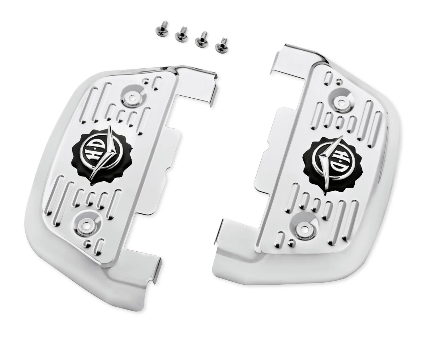 The latest in the family of Road King Classic-inspired accessories, this chrome-plated steel footboard cover features a chrome die-cast Road King Classic medallion with black accents and a stylish leather accent piece.