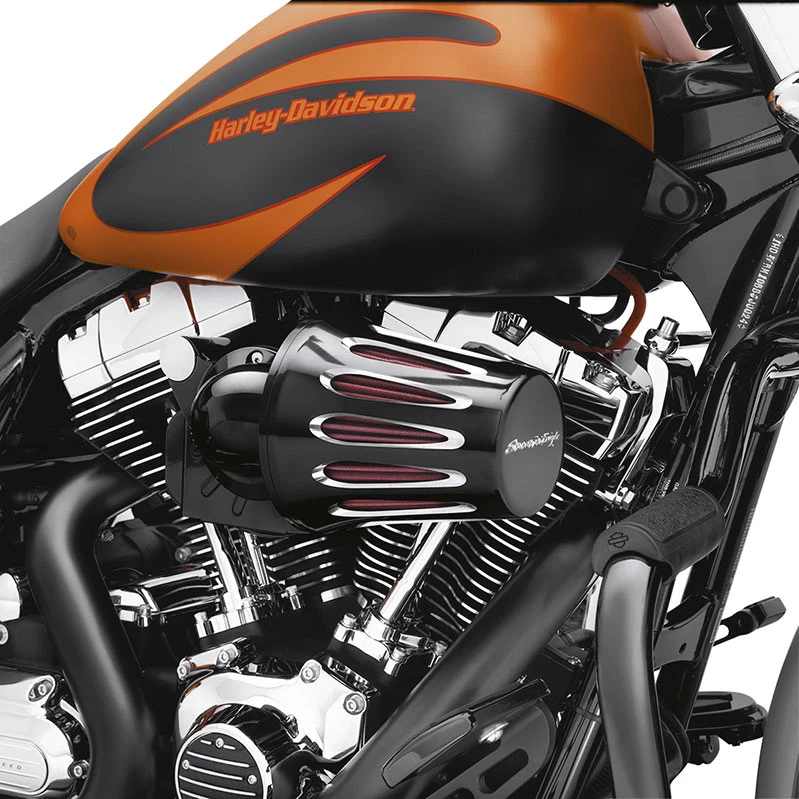 Fits Harley-Davidson Twin Cam & Sportster XL with Heavy Breather Air Cleaner filter elements (except Compact Version P/N 28716-10). Does not fit with decorative filter end caps. Cut Back Black – End Logo.