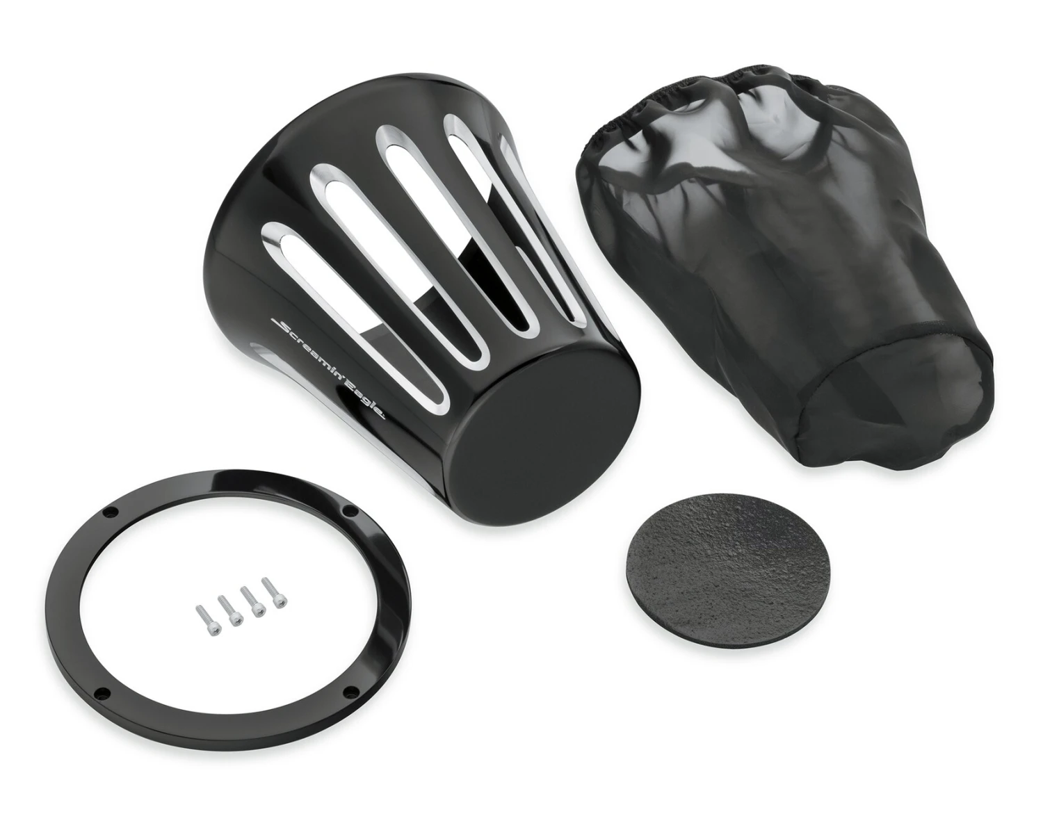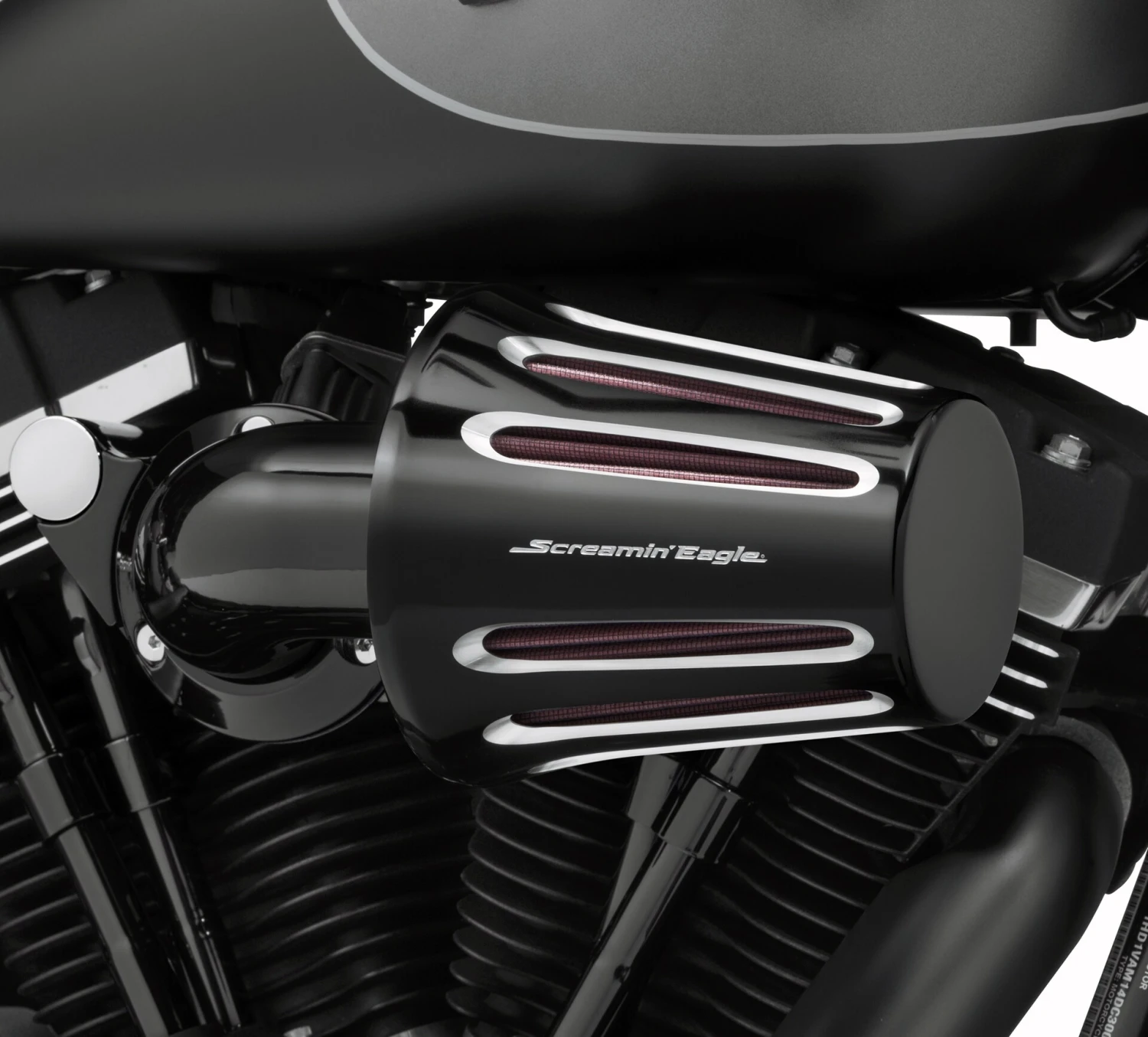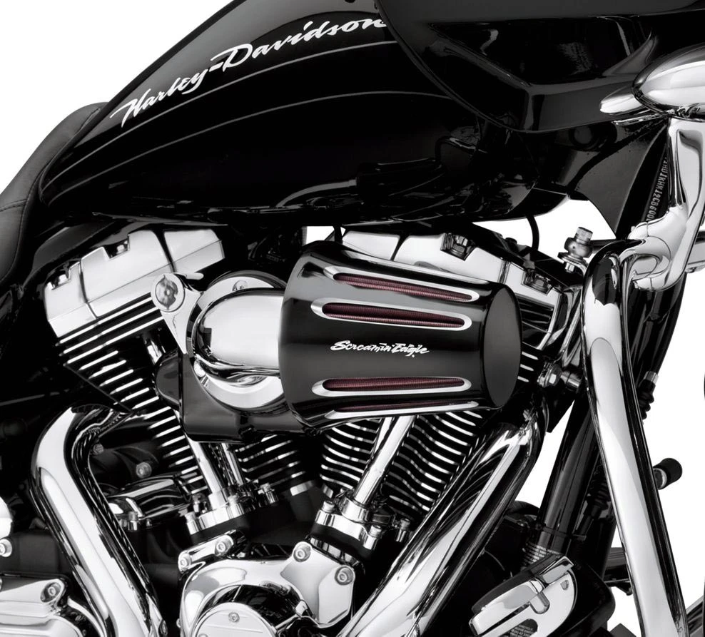 Fits Harley-Davidson Twin Cam & Sportster XL with Heavy Breather Air Cleaner filter elements (except Compact Version P/N 28716-10). Does not fit with decorative filter end caps. Cut Back Black – Side Logo.