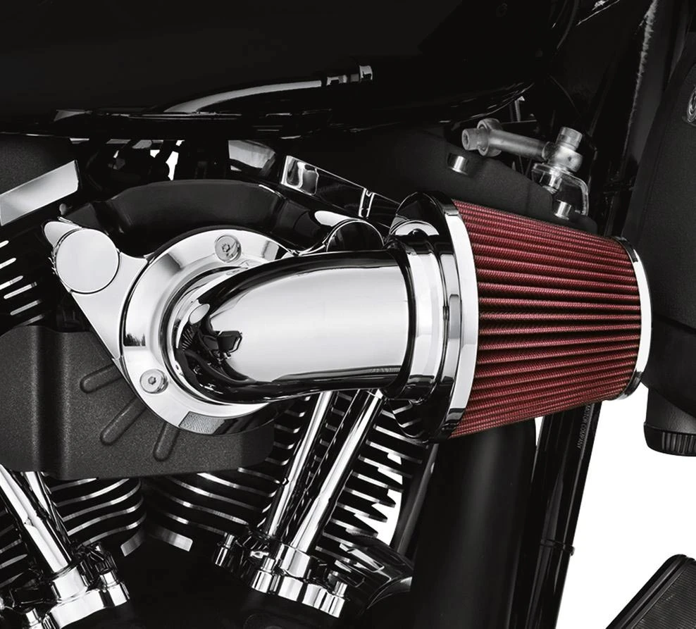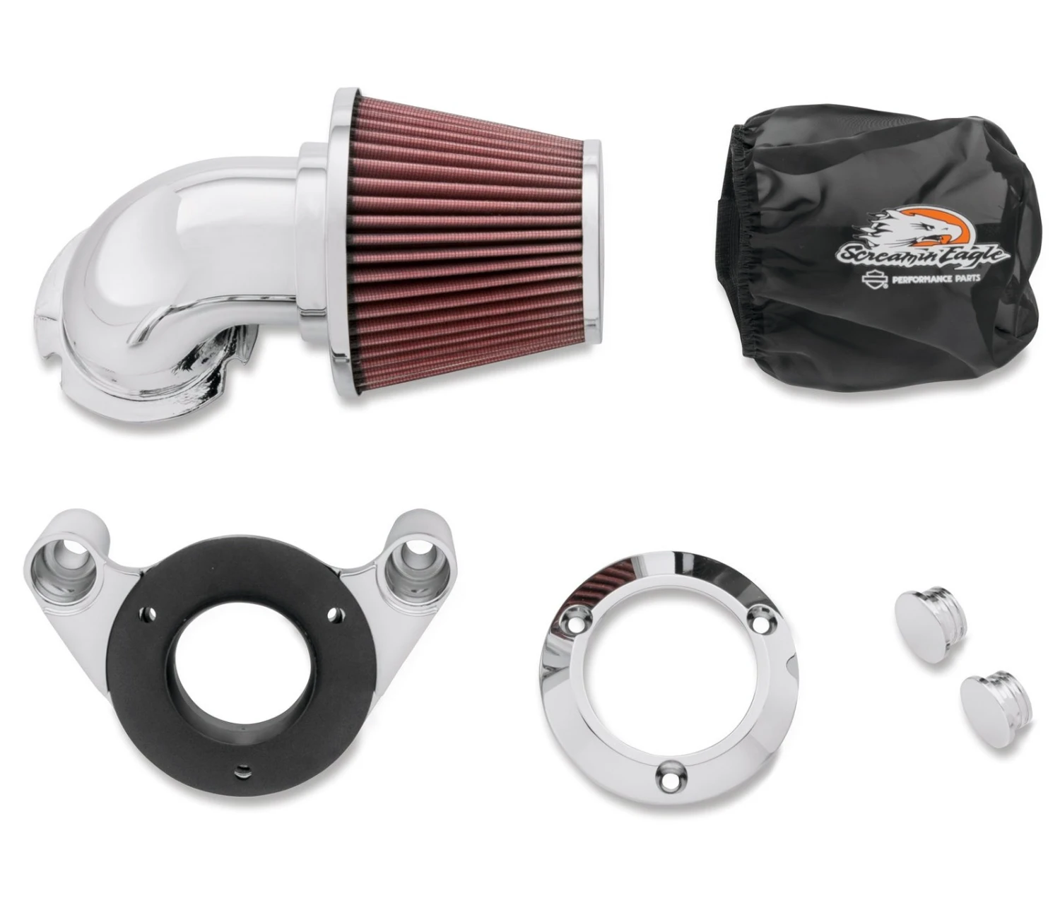 - Featuring a polished elbow and exposed filter, this unique air cleaner system offers improved performance and airflow when compared to the stock or Screamin‘ Eagle High-Flow Air Cleaner