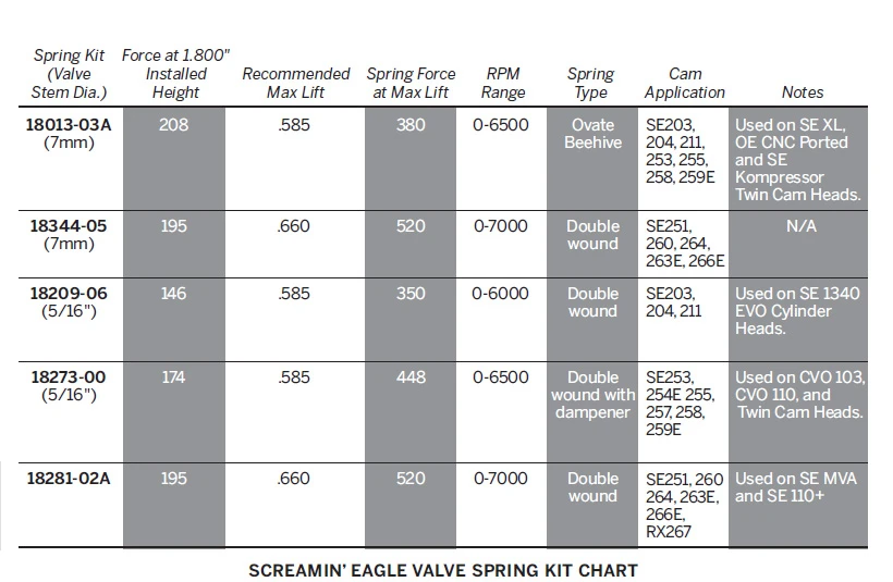 Fits Harley-Davidson ’04-later XL, XR and ’05-later Twin Cam-equipped models. Does not fit Screamin‘ Eagle Performance Heads with 5/16″ diameter valves. Proper valve spring to rocker cover clearance must always be verified during installation of Screamin Eagle Valve Spring Kits. Failure to have adequate clearance may result in engine damage.
