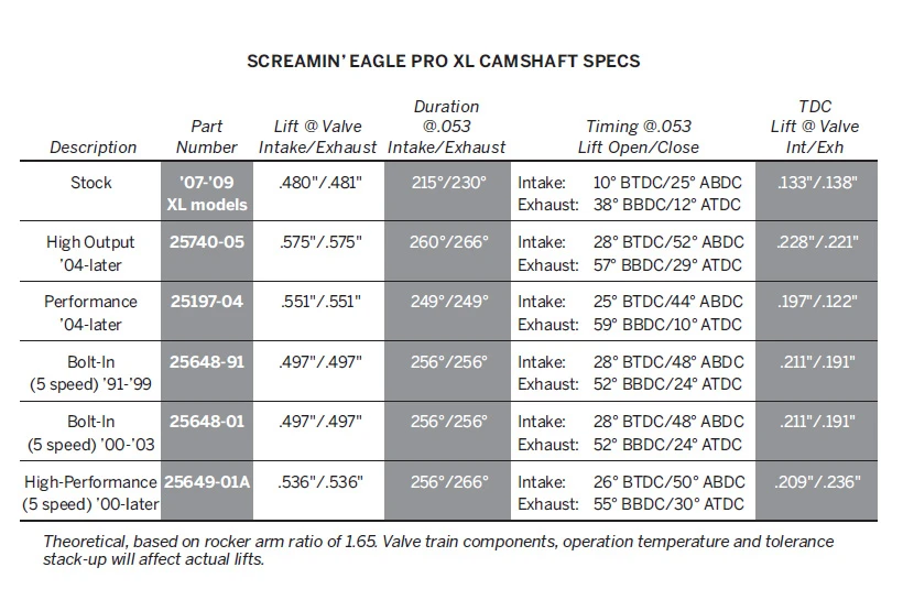 This High-Output Cam Kit is designed to work with compression ratios up to 11.3:1 when used with Screamin Eagle Performance Cylinder Heads P/N 16677-05 and High-Compression Piston Kit P/N 22711-04A.