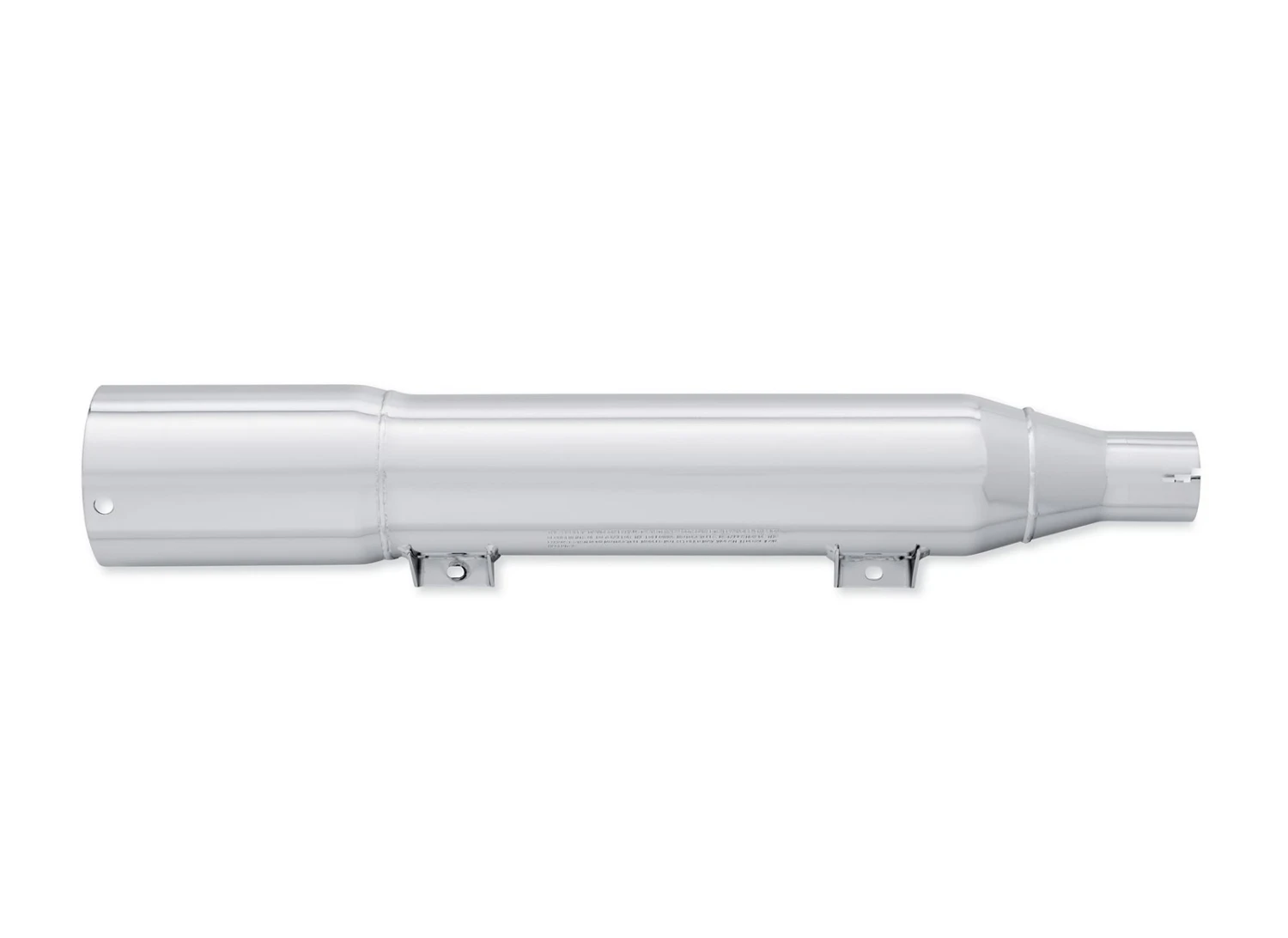 Tuned to provide a deep base exhaust note and great rumble throughout the RPM range, this 4.5 Street Cannon muff delivers the famous Harley® sound while preserving the peace with your neighbors. You get a nice bark when you get on the throttle, and a deep mellow tone when cruising at constant speed. The tuned baffle works with the internal high flow catalyst to strike the perfect balance required to deliver performance that you can feel in your gut. The large 4.5″ diameter Street Cann provides free flow of exhaust gases with just the right amount of back pressure for a smooth-running ride, and can be fitted with a wide variety of styled muffler end caps to provide the perfect finishing touch. Requires choice of chrome or satin black muffler shield with laser etched logo.