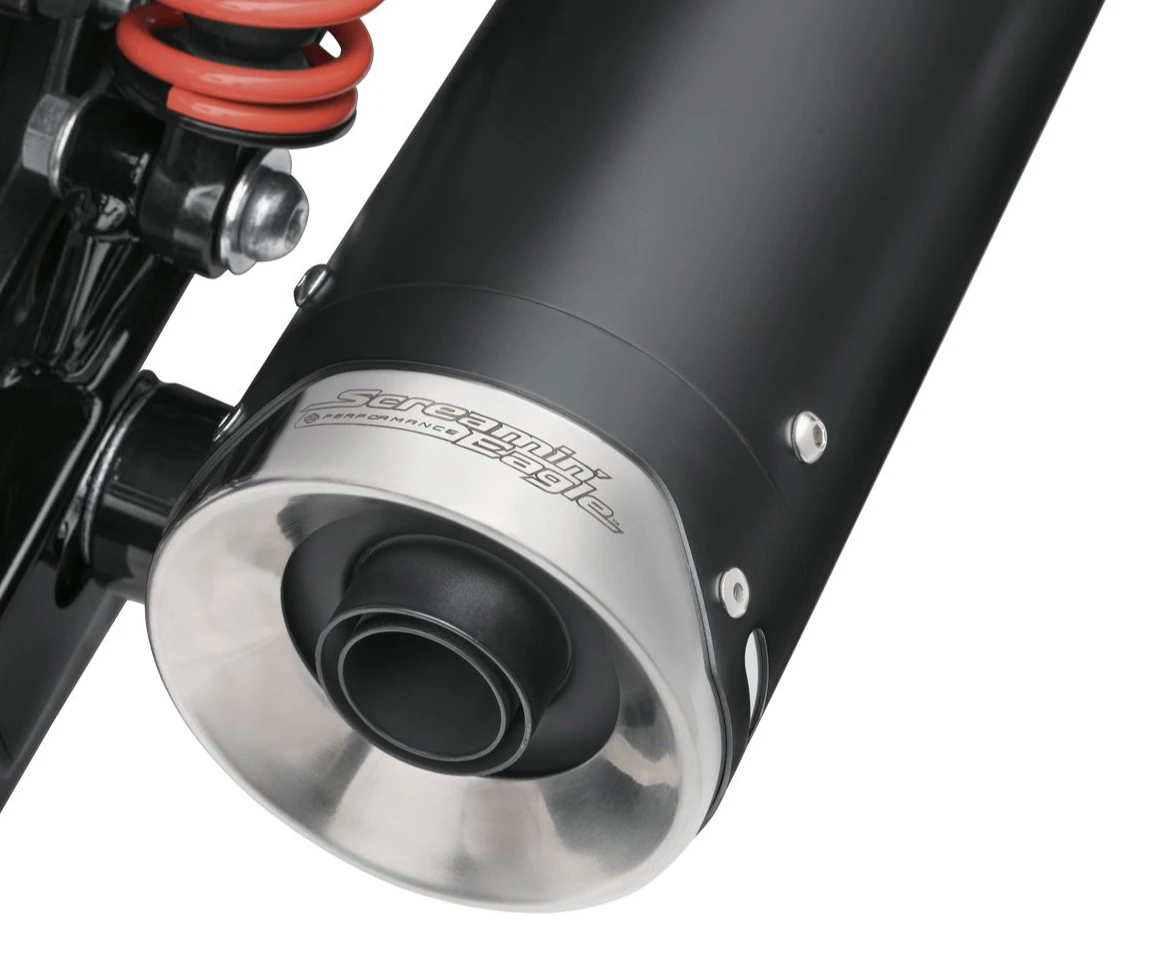 - Contrasting bright stainless end cap is finished with a laser-engraved Screamin Eagle logo