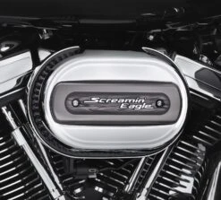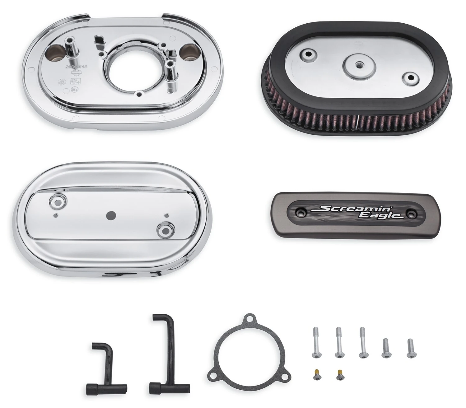 - Produces significant performance gains, while the stylish cover is tapered for added leg clearance Includes low-profile air cleaner cover, high-flow filter element, cast aluminum back plate, diamond-cut Screamin Eagle medallion, and all required installation hardware