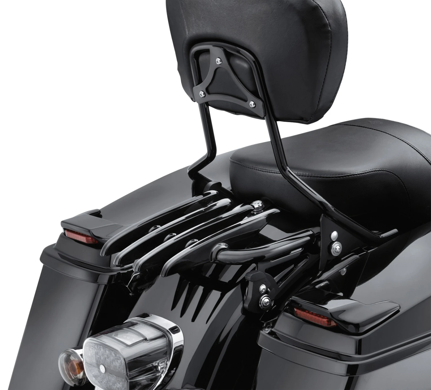Fits Harley-Davidson Touring 09-later with 4-Point Hardware Kits (except Trike, ’09-later CVO models with rigid mount Tour-Pak and ’14 Touring models with rigid mount Tour-Pak). ’09-’13 FLHTC, FLHTCU, FLHTK and FLTRU models equipped with Original Equipment rigid-mount Tour-Pak require Detachable Tour-Pak Rack Kit P/N 53246-09A. FLHX, FLHXS, FLTR and FLTRX models require separate purchase of
