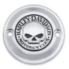 Add a little attitude to your ride. The menacing raised skull with black-filled eyes leaps from a field of chrome. The surrounding „Harley-Davidson® Motorcycles“ script is the perfect finishing touch.