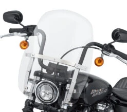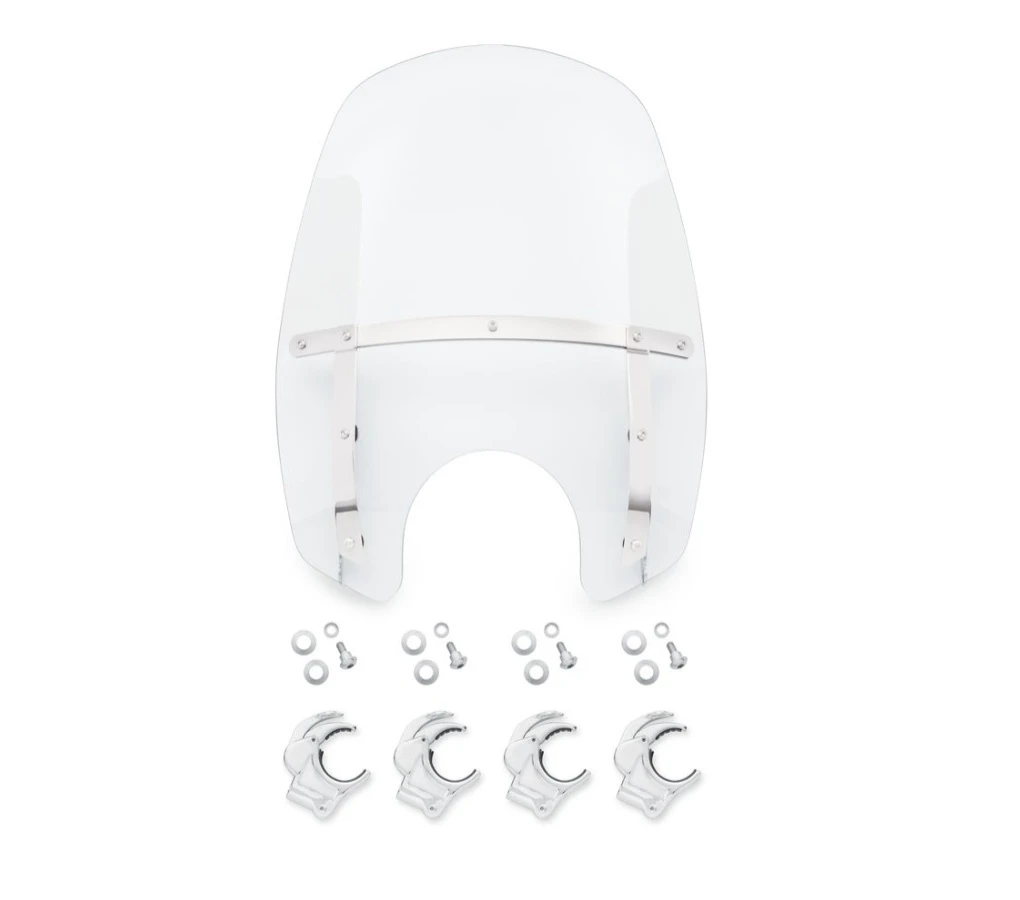 Engineered to provide the riding comfort of a larger windshield, this Wind Splitter Windshield features a contemporary contour that sets it apart from the crowd. The compact shape is designed to keep the windshield below your line of sight so you dont need to look through bugs and road grime, while the flipped upper edge manages airflow and turbulence across the top of the shield. The flip adds additional wind shear lift to provide the protection of a taller wind screen. You get a fatigue-free highway ride with reduced pressure on your chest and arms, and the detachable design means you can ride without the shield when the mood strikes.